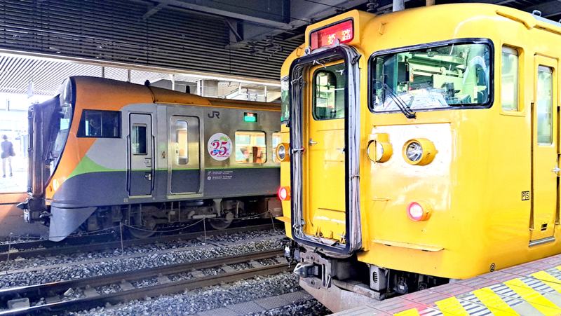 2023年夏岡山駅に到着したJR四国8000系瀬戸大橋線開業35周年ステッカー付きだったので115系電車と一緒に写真撮影